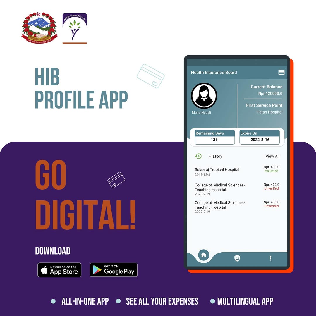 नेपाल सरकार स्वास्थ्य बीमा बोर्ड ले बीमितहरुको सहजता र जानकारीको लागि (आफ्नो विवरण आफ्नो हातमा) HIB Profile Application संचालनमा ल्याएको छ । Application लाई Play store र App store बाट download गरि Download पश्चात सम्बन्धित बिमितको बीमा नंबर घरमुलीको बीमा नंबर र जन्मिति राखी Application मा प्रवेश गर्न सकिनेछ। विवरण राख्दा verify हुन नसकेमा उक्त बिबरण जस्तै : जन्मिति,फोन नं बोर्डको System मा गलत प्रबिस्ट भएको छ भने आफ्नो जिल्लाहरुमा रहेको स्वास्थ्य बीमा बोर्डको जिल्ला सम्पर्क कार्यालयहरुमा सम्पर्क गरि सच्याउन सकिनेछ। अथवा www.hib.gov.np मा हेर्न सकिनेछ ।HIB Profile App मा सेवा लिएको बिवरण, Policy विवरण, Active/ In-Active विवरण, नबिकरण भए/नभएको हेर्न पनि सकिन्छ।