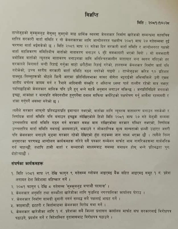 फुङलिङ नगरपालिकाले केबलकारलाई देशको विकास र पर्यटनको प्रगतिका रूपमा सबैले बुझन आग्रह गरेको छ । यता आन्दोलनरत पक्षले आज सात बुदे आन्दोलन का कार्यक्रमको घोसणा सहितको प्रतिबेदन जारी गरेको छ I