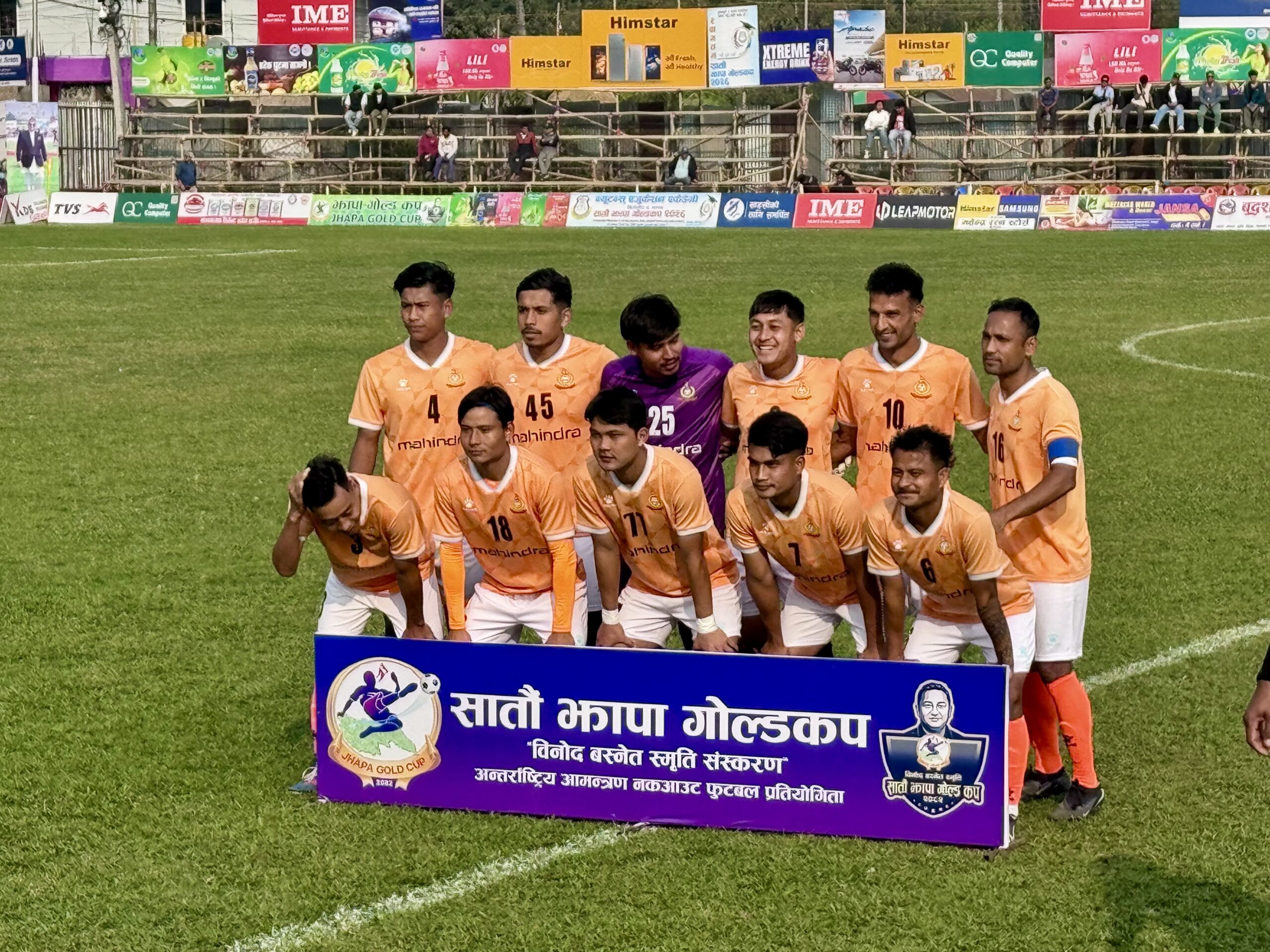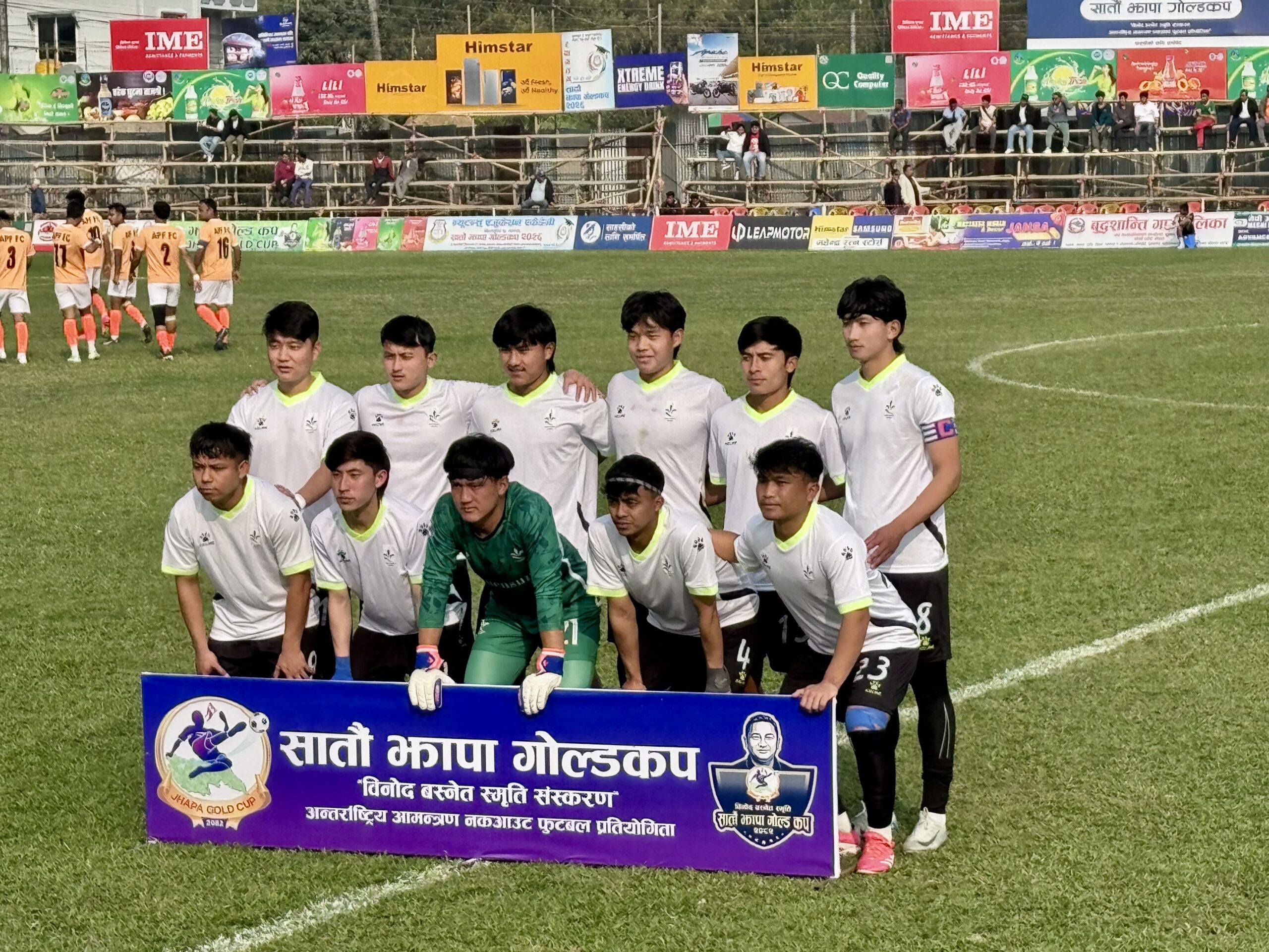 सशस्त्र प्रहरीको एपिएफ फुटबल क्लबले हरि कार्कीको ह्याट्रिक मद्दतमा भुटानको रोयल थिम्पु कलेजलाई ४–१ गोल अन्तरले पराजित गर्दै झापा गोल्डकपको सेमिफाइनल प्रवेश गरेको छ । एकपक्षीय खेलमा एपिएफले खेल अवधिभर भुटानलाई दबाबमा राखेको थियो । खेलको छैटौँ मिनेटमै एपिएफले गोलको खाता खोल्यो । एपिएफका स्ट्राइकर प्रदिप लामाले करिब ३० यार्डबाट गरेको लङ रेञ्जर सटले जाली चुमेको थियो । एपिएफको लागि अर्को गोल कप्तान हरि कार्कीको नाममा रह्यो । उनले खेलको १८ औँ मिनेटमा दिपेश धिमालले डिबक्समा मिलाइदिएको पासलाई गोल गर्दै अग्रता दोब्बर बनाएका थिए ।
